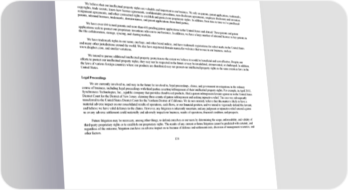 2/24/2018 S-1 Table of Contents • continued innovation; and • pricing. We believe we compete favorably across these factors and are largely unhindered by legacy constraints. However, some of our competitors may have greater name recognition, longer operating histories, more varied services, the ability to bundle a broader range of products and services, larger marketing budgets, established marketing relationships, access to larger user bases, major distribution agreements with hardware manufacturers and resellers, and greater financial, technical, and other resources. Intellectual Property We believe that our intellectual property rights are valuable and important to our business. We rely on patents, patent applications, trademarks, copyrights, trade secrets, knowhow license agreements, confidentiality procedures, nondisclosure agreements, employee disclosure and invention assignment agreements, and other contractual rights to establish and protect our proprietary rights. In addition, from time to time we’ve purchased patents, inbound licenses, trademarks, domain names, and patent applications from third parties. We have over 600 issued patents and more than 600 pending patent applications in the United States and abroad. These patents and patent applications seek to protect our proprietary inventions relevant to our business. In addition, we have a large number of inbound licenses to key patents in the file collaboration, storage, syncing, and sharing markets. We have trademark rights in our name, our logo, and other brand indicia, and have trademark registrations for select marks in the United States and many other jurisdictions around the world. We also have registered domain names for websites that we use in our business, such as www.dropbox.com, and similar variations. We intend to pursue additional intellectual property protection to the extent we believe it would be beneficial and cost effective. Despite our efforts to protect our intellectual property rights, they may not be respected in the future or may be invalidated, circumvented, or challenged. In addition, the laws of various foreign countries where our products are distributed may not protect our intellectual property rights to the same extent as laws in the United States. Legal Proceedings We are currently involved in, and may in the future be involved in, legal proceedings, claims, and government investigations in the ordinary course of business, including legal proceedings with third parties asserting infringement of their intellectual property rights. For example, in April 2015, Synchronoss Technologies, Inc., a public company that provides cloudbased products, filed a patent infringement lawsuit against us in the United States District Court for the District of New Jersey, claiming three counts of patent infringement and seeking injunctive relief. The case was subsequently transferred to the United States District Court for the Northern District of California. We do not currently believe that this matter is likely to have a material adverse impact on our consolidated results of operations, cash flows, or our financial position, and we intend to vigorously defend this lawsuit, and believe we have valid defenses to the claims. However, any litigation is inherently uncertain, and any judgment or injunctive relief entered against us or any adverse settlement could materially and adversely impact our business, results of operations, financial condition, and prospects. Future litigation may be necessary, among other things, to defend ourselves or our users by determining the scope, enforceability, and validity of thirdparty proprietary rights or to establish our proprietary rights. The results of any current or future litigation cannot be predicted with certainty, and regardless of the outcome, litigation can have an adverse impact on us because of defense and settlement costs, diversion of management resources, and other factors. 124 https://www.sec.gov/Archives/edgar/data/1467623/000119312518055809/d451946ds1.htm 132/235