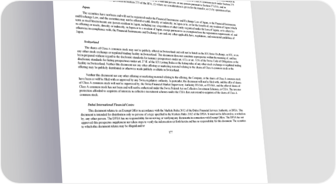 2/24/2018 S-1 Table of Contents (ii) to a relevant person, or any person pursuant to Section 275(1A), and in accordance with the conditions, specified in Section 275 of the SFA, or (iii) otherwise pursuant to, and in accordance with the conditions of, any other applicable provision of the SFA. Where the shares of Class A common stock are subscribed or purchased under Section 275 by a relevant person which is: (a) a corporation (which is not an accredited investor) the sole business of which is to hold investments and the entire share capital of which is owned by one or more individuals, each of whom is an accredited investor; or (b) a trust (where the trustee is not an accredited investor) whose sole purpose is to hold investments and each beneficiary is an accredited investor, shares, debentures, and units of shares and debentures of that corporation or the beneficiaries’ rights and interest in that trust shall not be transferable for six months after that corporation or that trust has acquired the shares of Class A common stock under Section 275 except: (1) to an institutional investor under Section 274 of the SFA or to a relevant person, or any person pursuant to Section 275(1A), and in accordance with the conditions, specified in Section 275 of the SFA; (2) where no consideration is given for the transfer; or (3) by operation of law. Japan The securities have not been and will not be registered under the Financial Instruments and Exchange Law of Japan, or the Financial Instruments and Exchange Law, and the securities may not be offered or sold, directly or indirectly, in Japan or to, or for the benefit of, any resident of Japan (which term as used herein means any person resident in Japan, including any corporation or other entity organized under the laws of Japan), or to others for reoffering or resale, directly or indirectly, in Japan or to a resident of Japan, except pursuant to an exemption from the registration requirements of, and otherwise in compliance with, the Financial Instruments and Exchange Law and any other applicable laws, regulations, and ministerial guidelines of Japan. Switzerland The shares of Class A common stock may not be publicly offered in Switzerland and will not be listed on the SIX Swiss Exchange, or SIX, or on any other stock exchange or regulated trading facility in Switzerland. This document does not constitute a prospectus within the meaning of, and has been prepared without regard to the disclosure standards for issuance prospectuses under art. 652a or art. 1156 of the Swiss Code of Obligations or the disclosure standards for listing prospectuses under art. 27 ff. of the SIX Listing Rules or the listing rules of any other stock exchange or regulated trading facility in Switzerland. Neither this document nor any other offering or marketing material relating to the shares of Class A common stock or the offering may be publicly distributed or otherwise made publicly available in Switzerland. Neither this document nor any other offering or marketing material relating to the offering, the Company, or the shares of Class A common stock have been or will be filed with or approved by any Swiss regulatory authority. In particular, this document will not be filed with, and the offer of shares of Class A common stock will not be supervised by, the Swiss Financial Market Supervisory Authority FINMA, or FINMA, and the offer of shares of Class A common stock has not been and will not be authorized under the Swiss Federal Act on Collective Investment Schemes, or CISA. The investor protection afforded to acquirers of interests in collective investment schemes under the CISA does not extend to acquirers of the shares of Class A common stock. Dubai International Financial Centre This document relates to an Exempt Offer in accordance with the Markets Rules 2012 of the Dubai Financial Services Authority, or DFSA. This document is intended for distribution only to persons of a type specified in the Markets Rules 2012 of the DFSA. It must not be delivered to, or relied on by, any other person. The DFSA has no responsibility for reviewing or verifying any documents in connection with Exempt Offers. The DFSA has not approved this prospectus supplement nor taken steps to verify the information set forth herein and has no responsibility for this document. The securities to which this document relates may be illiquid and/or 177 https://www.sec.gov/Archives/edgar/data/1467623/000119312518055809/d451946ds1.htm 185/235