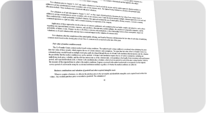 2/24/2018 S-1 Table of Contents • Any adjustments necessary to recognize a lack of marketability for our common stock; and • Precedent sales of or offers to purchase our capital stock. In valuing our common stock, our Board of Directors determined the fair value of our common stock using both the income and market approach valuation methods. The income approach estimates value based on the expectation of future cash flows that a company will generate. These future cash flows are discounted to their present values using a discount rate based on our weighted average cost of capital, and is adjusted to reflect the risks inherent in our cash flows. The market approach estimates value based on a comparison of the subject company to comparable public companies in a similar line of business. From the comparable companies, a representative market value multiple is determined and then applied to the subject company’s financial forecasts to estimate the value of the subject company. For valuations prior to August 31, 2017, the equity valuation was based on both the income and the market approach valuation methods, in addition to giving consideration to recent secondary sales of our common stock. The Option Pricing Method was selected as the principal equity allocation method. These methods were consistent with prior valuations. For valuations as of and subsequent to August 31, 2017, we have used a hybrid method to determine the fair value of our common stock, in addition to giving consideration to recent secondary sales of our common stock. Under the hybrid method, multiple valuation approaches were used and then combined into a single probability weighted valuation. Our approach included the use of initial public offering scenarios, a scenario assuming continued operation as a private entity, and a scenario assuming an acquisition of the company. Application of these approaches involves the use of estimates, judgment, and assumptions that are highly complex and subjective, such as those regarding our expected future revenue, expenses, and cash flows, discount rates, market multiples, the selection of comparable companies, and the probability of future events. Changes in any or all of these estimates and assumptions, or the relationships between those assumptions, impact our valuations as of each valuation date and may have a material impact on the valuation of common stock. For valuations after the completion of this initial public offering, our Board of Directors will determine the fair value of each share of underlying common stock based on the closing price of our Class A common stock as reported on the date of the grant. Fair value of market condition awards The CoFounder Grants contain marketbased vesting conditions. The marketbased vesting condition is considered when calculating the grant date fair value of these awards, which requires the use of various estimates and assumptions. The grant date fair value of the CoFounder Grants was estimated using a model based on multiple stock price paths developed through the use of a Monte Carlo simulation that incorporates into the valuation the possibility that the market condition may not be satisfied. A Monte Carlo simulation requires the use of various assumptions, including our underlying stock price, volatility, and the riskfree interest rate as of the valuation date, corresponding to the length of time remaining in the performance period, and expected dividend yield. A Monte Carlo simulation also calculates a derived service period for each of the nine vesting tranches, which is the measure of the expected time to achieve the market conditions. Expense associated with marketbased awards is recognized over the requisite service period of each tranche using the accelerated attribution method, regardless of whether the market conditions are achieved. Business combinations and valuation of goodwill and other acquired intangible assets When we acquire a business, we allocate the purchase price to the net tangible and identifiable intangible assets acquired based on their fair values. Any residual purchase price is recorded as goodwill. The estimation of 85 https://www.sec.gov/Archives/edgar/data/1467623/000119312518055809/d451946ds1.htm 93/235