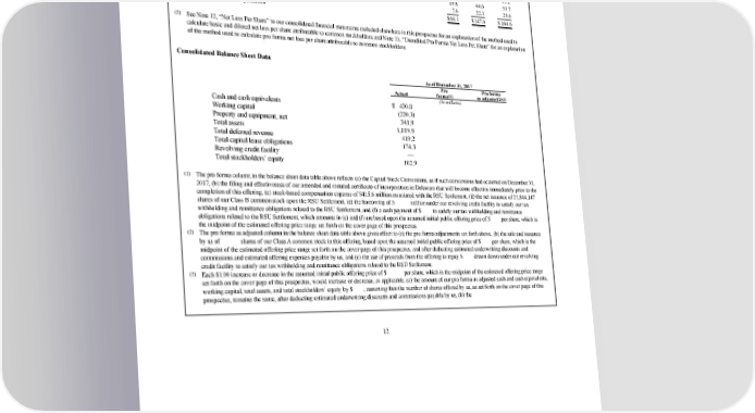 2/24/2018 S-1 Table of Contents (1) Includes stockbased compensation as follows: Year ended December 31, 2015 2016 2017 (In millions) Cost of revenue $ 2.6 $ 8.2 $ 12.2 Research and development 36.1 72.7 93.1 Sales and marketing 19.8 44.6 33.7 General and administrative 7.6 22.1 25.6 Total stockbased compensation $66.1 $147.6 $ 164.6 (2) See Note 12, “Net Loss Per Share” to our consolidated financial statements included elsewhere in this prospectus for an explanation of the method used to calculate basic and diluted net loss per share attributable to common stockholders and Note 13, “Unaudited Pro Forma Net Loss Per Share” for an explanation of the method used to calculate pro forma net loss per share attributable to common stockholders. Consolidated Balance Sheet Data As of December 31, 2017 Pro Pro forma (1) (2)(3) Actual forma as adjusted (In millions) Cash and cash equivalents $ 430.0 Working capital (220.3) Property and equipment, net 341.9 Total assets 1,019.9 Total deferred revenue 419.2 Total capital lease obligations 174.3 Revolving credit facility — Total stockholders’ equity 102.9 (1) The pro forma column in the balance sheet data table above reflects (a) the Capital Stock Conversions, as if such conversions had occurred on December 31, 2017, (b) the filing and effectiveness of our amended and restated certificate of incorporation in Delaware that will become effective immediately prior to the completion of this offering, (c) stockbased compensation expense of $415.6 million associated with the RSU Settlement, (d) the net issuance of 23,844,147 shares of our Class B common stock upon the RSU Settlement, (e) the borrowing of $ million under our revolving credit facility to satisfy our tax withholding and remittance obligations related to the RSU Settlement, and (f) a cash payment of $ to satisfy our tax withholding and remittance obligations related to the RSU Settlement, which amounts in (e) and (f) are based upon the assumed initial public offering price of $ per share, which is the midpoint of the estimated offering price range set forth on the cover page of this prospectus. (2) The pro forma as adjusted column in the balance sheet data table above gives effect to (a) the pro forma adjustments set forth above, (b) the sale and issuance by us of shares of our Class A common stock in this offering, based upon the assumed initial public offering price of $ per share, which is the midpoint of the estimated offering price range set forth on the cover page of this prospectus, and after deducting estimated underwriting discounts and commissions and estimated offering expenses payable by us, and (c) the use of proceeds from the offering to repay $ drawn down under our revolving credit facility to satisfy our tax withholding and remittance obligations related to the RSU Settlement. (3) Each $1.00 increase or decrease in the assumed initial public offering price of $ per share, which is the midpoint of the estimated offering price range set forth on the cover page of this prospectus, would increase or decrease, as applicable, (a) the amount of our pro forma as adjusted cash and cash equivalents, working capital, total assets, and total stockholders’ equity by $ , assuming that the number of shares offered by us, as set forth on the cover page of this prospectus, remains the same, after deducting estimated underwriting discounts and commissions payable by us, (b) the 12 https://www.sec.gov/Archives/edgar/data/1467623/000119312518055809/d451946ds1.htm 19/235