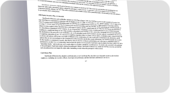 2/24/2018 S-1 Table of Contents price of shares covered by each outstanding award subject to any required action by our Board of Directors or stockholders. Dissolution or liquidation. In the event of our proposed liquidation or dissolution, our Board of Directors may terminate any and all outstanding awards followed by the payment of creditors and the distribution of any remaining funds to the our stockholders. Acquisition or other combination. If we are subject to an acquisition, consolidation, or merger, or similar conversion event, outstanding awards under our 2017 Plan shall be subject to the agreement evidencing such transaction. The agreement may provide for the continuation, assumption, or substitution of outstanding awards by us (if we are the surviving corporation) or the successor or acquiring entity (if any), or the full or partial exercisability or vesting and accelerated expiration of awards, or the settlement of the full value of outstanding awards in cash, cash equivalents, or securities of the successor or its parent followed by the cancellation of such awards. If an outstanding award is not continued, assumed, or substituted, the award will terminate and cease to be outstanding immediately following the occurrence of the applicable transaction. Amendment; termination. Our Board of Directors may terminate or amend our 2017 Plan at any time, provided that such amendment does not impair the rights under outstanding options without the participant’s written consent. As noted above, prior to the adoption of our 2018 Plan in connection with this offering, our 2017 Plan will be terminated and no further awards will be granted thereunder. All outstanding awards will continue to be governed by their existing terms. 2008 Equity Incentive Plan, As Amended Our Board of Directors and stockholders adopted our 2008 Plan in January 2008. Our 2008 Plan was most recently amended in November 2016. Our 2008 Plan was terminated in connection with our adoption of our 2017 Plan. As of December 31, 2017, options to purchase 7,439,253 shares of our Class B common stock remained outstanding under our 2008 Plan at a weightedaverage exercise price of approximately $7.01 per share and RSUs covering 57,329,003 shares of our Class B common stock remained outstanding under our 2008 Plan. Awards granted under the 2008 Plan generally are subject to terms similar to those described above with respect to options and RSUs granted under the 2017 Plan. Our 2008 Plan provides that if there is (i) a dissolution or liquidation of the Company, (ii) any reorganization, consolidation, merger, or similar transaction or series of related transactions resulting in a significant change in our voting securities as described in our 2008 Plan, or (iii) a sale of all or substantially all of our assets followed by the distribution of the proceeds to our stockholders, any or all outstanding awards may be assumed, converted, replaced, or substituted by the successor or acquiring corporation (if any). If a successor or acquiring corporation refuses to assume, convert, replace, or substitute awards, vesting of awards will accelerate and options will become exercisable in full prior to the consummation of event on such terms as determined by the administrator, and all options that are not exercised prior to the consummation of the transaction and all other awards will terminate. Our 2008 Plan generally does not allow for the transfer or assignment of awards, other than by will or by the laws of descent and distribution and, with respect to nonqualified options, by instrument to an inter vivos or testamentary trust in which the options are to be passed to beneficiaries upon the death of the trustor (settlor) or by gift to “immediate family,” and awards may not be made subject to execution, attachment, or similar process. An award is only exercisable by the participant or the participant’s legal representative during the participant’s lifetime. Our Board of Directors may amend our 2008 Plan at any time, provided that such amendment does not impair the rights under outstanding awards without the participant’s written consent. Cash Bonus Plan Our Board of Directors has adopted a cash bonus plan, or our Cash Bonus Plan, that allows us to financially incentivize and reward our employees, including our executive officers, based upon our performance and their individual contributions to our success. 147 https://www.sec.gov/Archives/edgar/data/1467623/000119312518055809/d451946ds1.htm 155/235