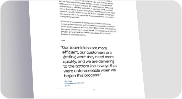 2/24/2018 S-1 Table of Contents Brandt Brandt is a large mechanical, electrical, and plumbing contractor that services facilities like schools and hospitals across Texas. Before adopting Dropbox, Brandt’s field technicians relied on paperwork, scanners, printers, and fax machines to communicate with their company headquarters and customers. In 2014, Brandt purchased 120 Dropbox Business licenses and deployed them on tablets for technicians on job sites to update forms and work orders in shared Dropbox folders. Brandt also integrated its own digital signature app with Dropbox to make the process even easier. Signed forms save automatically to the appropriate Dropbox shared folder, which notifies the approving supervisor. Brandt has since expanded its deployment to 250 Dropbox Business licenses, and estimates that each field technician saves up to one hour per service call on document processing. With 120 technicians each completing two service calls per day on average, Brandt calculates savings of $400,000 per year—or more than three times the annual cost of the company’s Dropbox Business subscription. “Our technicians are more efficient, our customers are getting what they need more quickly, and we are delivering to the bottom line in ways that were unforeseeable when we began this process.” Jim Stagg Vice President of Service Brandt 114 https://www.sec.gov/Archives/edgar/data/1467623/000119312518055809/d451946ds1.htm 122/235