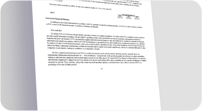 2/24/2018 S-1 Table of Contents Average revenue per paying user We define average revenue per paying user, or ARPU, as our revenue for the period presented divided by the average paying users during the same period. For interim periods, we use annualized revenue, which is calculated by dividing the revenue for the particular period by the number of days in that period and multiplying this value by 365 days. Average paying users are calculated based on adding the number of paying users as of the beginning of the period to the number of paying users as of the end of the period, and then dividing by two. Our ARPU declined for the year ended December 31, 2016, compared to the year ended December 31, 2015, primarily due to foreign currency fluctuations related to our sales that are denominated in foreign currencies. Our ARPU increased for the year ended December 31, 2017, compared to the year ended December 31, 2016, primarily due to an increased mix of sales towards our higher priced subscription plans, including our new Dropbox Business Advanced plan. The below table sets forth our ARPU for the years ended December 31, 2015, 2016, and 2017. Year ended December 31, 2015 2016 2017 ARPU $113.54 $110.54 $111.91 NonGAAP Financial Measure In addition to our results determined in accordance with U.S. generally accepted accounting principles, or GAAP, we believe that free cash flow, or FCF, a nonGAAP financial measure, is useful in evaluating our liquidity. Free cash flow We define FCF as GAAP net cash provided by operating activities less capital expenditures. We believe that FCF is a liquidity measure and that it provides useful information regarding cash provided by operating activities and cash used for investments in property and equipment required to maintain and grow our business. FCF is presented for supplemental informational purposes only and should not be considered a substitute for financial information presented in accordance with GAAP. FCF has limitations as an analytical tool, and it should not be considered in isolation or as a substitute for analysis of other GAAP financial measures, such as net cash provided by operating activities. Some of the limitations of FCF are that FCF does not reflect our future contractual commitments, excludes investments made to acquire assets under capital leases, and may be calculated differently by other companies in our industry, limiting its usefulness as a comparative measure. We have experienced an increase in our FCF as a result of an increase in net cash provided by operating activities, primarily due to our Infrastructure Optimization discussed below in “ —Recent Initiative,” increased sales in the periods presented, and a decrease in capital expenditures relating to infrastructure equipment and leasehold improvements for our office spaces. We expect our FCF to fluctuate in future periods as we purchase infrastructure equipment to support our user base and invest in our new and existing office spaces, including our new corporate headquarters, to support our plans for growth. These activities, along with certain increased operating expenses as described below, may result in a decrease in FCF as a percentage of revenue in future periods. 66 https://www.sec.gov/Archives/edgar/data/1467623/000119312518055809/d451946ds1.htm 74/235