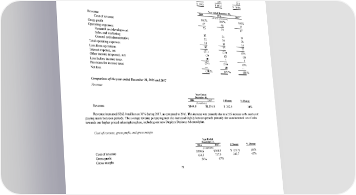 2/24/2018 S-1 Table of Contents (1) Includes stockbased compensation as follows: Year ended December 31, 2015 2016 2017 (In millions) Cost of revenue $ 2.6 $ 8.2 $ 12.2 Research and development 36.1 72.7 93.1 Sales and marketing 19.8 44.6 33.7 General and administrative 7.6 22.1 25.6 Total stockbased compensation $ 66.1 $ 147.6 $ 164.6 Year ended December 31, 2015 2016 2017 (As a % of revenue) Revenue 100% 100% 100% Cost of revenue 67 46 33 Gross profit 33 54 67 Operating expenses: Research and development 33 34 34 Sales and marketing 32 30 28 General and administrative 18 13 14 Total operating expenses 83 77 77 Loss from operations (51) (23) (10) Interest expense, net (3) (2) (1) Other income (expense), net (1) 1 1 Loss before income taxes (54) (24) (10) Provision for income taxes — (1) — Net loss (54)% (25)% (10)% Comparison of the year ended December 31, 2016 and 2017 Revenue Year Ended December 31, 2016 2017 $ Change % Change (In millions) Revenue $844.8 $1,106.8 $ 262.0 31% Revenue increased $262.0 million or 31% during 2017, as compared to 2016. This increase was primarily due to a 25% increase in the number of paying users between periods. The average revenue per paying user also increased slightly between periods primarily due to an increased mix of sales towards our higher priced subscription plans, including our new Dropbox Business Advanced plan. Cost of revenue, gross profit, and gross margin Year Ended December 31, 2016 2017 $ Change % Change (In millions) Cost of revenue $390.6 $368.9 $ (21.7) (6)% Gross profit 454.2 737.9 283.7 62% Gross margin 54% 67% 71 https://www.sec.gov/Archives/edgar/data/1467623/000119312518055809/d451946ds1.htm 79/235
