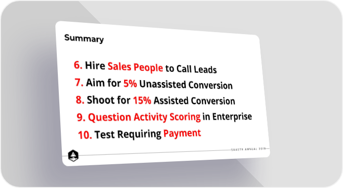 Summary 6. Hire Sales People to Call Leads 7. Aim for 5% Unassisted Conversion 8. Shoot for 15% Assisted Conversion 9. Question Activity Scoring in Enterprise 10. Test Requiring Payment