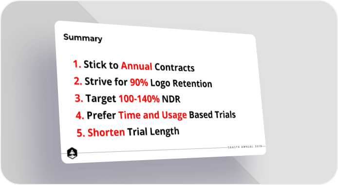 Summary 1. Stick to Annual Contracts 2. Strive for 90% Logo Retention 3. Target 100-140% NDR 4. Prefer Time and Usage Based Trials 5. Shorten Trial Length