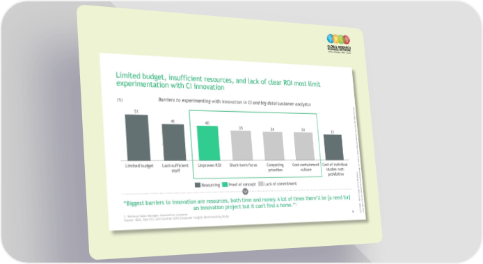 Limited budget, insufficient resources, and lack of clear ROI most limit experimentation with CI innovation (%) Barriers to experimenting with innovation in CI and big data/customer analytics 51 41 All rights reserved. 40 35 34 34 32 esearch Business Network. bal R The Glo Limited budget Lack sufficient Unproven ROI Short-term focus Competing Cost-containment Cost of individual staff priorities culture studies cost- prohibitive rt epo R Resourcing Proof of concept Lack of commitment he Boston Consulting Group, Inc. and T “Biggest barriers to innovation are resources, both time and money. A lot of times there’ll be [a need for] 1 an innovation project but it can't find a home.” 1. National Sales Manager, Automotive company Source: BCG, Yale CCI, and Cambiar 2015 Consumer Insights Benchmarking Study 9 4 BCG GRBN - ROI of Insight 2017 Study Copyright © 2017 by