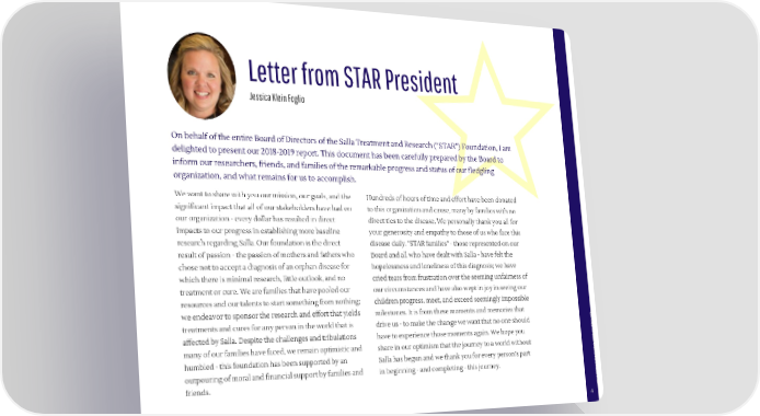 Letter from STAR President Jessica Klein Foglio On behalf of the entire Board of Directors of the Salla Treatment and Research (“STAR”) Foundation, I am delighted to present our 2018-2019 report. This document has been carefully prepared by the Board to inform our researchers, friends, and families of the remarkable progress and status of our fledgling organization, and what remains for us to accomplish. We want to share with you our mission, our goals, and the Hundreds of hours of time and effort have been donated significant impact that all of our stakeholders have had on to this organization and cause, many by families with no our organization - every dollar has resulted in direct direct ties to the disease. We personally thank you all for impacts to our progress in establishing more baseline your generosity and empathy to those of us who face this research regarding Salla. Our foundation is the direct disease daily. "STAR families" - those represented on our result of passion - the passion of mothers and fathers who Board and all who have dealt with Salla - have felt the chose not to accept a diagnosis of an orphan disease for hopelessness and loneliness of this diagnosis; we have which there is minimal research, little outlook, and no cried tears from frustration over the seeming unfairness of treatment or cure. We are families that have pooled our our circumstances and have also wept in joy in seeing our resources and our talents to start something from nothing; children progress, meet, and exceed seemingly impossible we endeavor to sponsor the research and effort that yields milestones. It is from these moments and memories that Letter from STAR President treatments and cures for any person in the world that is drive us - to make the change we want that no one should affected by Salla. Despite the challenges and tribulations have to experience those moments again. We hope you many of our families have faced, we remain optimistic and share in our optimism that the journey to a world without humbled - this foundation has been supported by an Salla has begun and we thank you for every person’s part outpouring of moral and financial support by families and in beginning - and completing - this journey. friends. 4