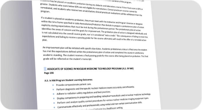 Additional information for Associate of Occupational Science in Ultrasound Technology (A.O.S. in UT), Associate of Occupational Science in Cardiac Ultrasound Technology (A.O.S. in CUT), and Associate of Occupational Science in Vascular Ultrasound Technology (A.O.S. in VUT) Programs Students in the Associate of Occupational Science in Ultrasound Technology, Associate of Occupational Science in Cardiac Ultrasound Technology, and Associate of Occupational Science in Vascular Ultrasound Technology Programs may be placed on remediation only for a maximum of one (1) General Education course (if applicable), or two (2) courses per quarter and are not to exceed the total of two (2) times throughout the entire duration of the program. Students may be placed on academic probation during any didactic and laboratory course if their final score is 60% or greater. Students who score below 60% are not eligible for remediation. Clinical practicum courses cannot be remediated, and students who receive two unsatisfactory clinical practicum evaluations will be withdrawn from the program. If a student is placed on academic probation, they must meet with the instructor and Program Director or designee within the time frame specified in table Remediation/Probation Plan Details to prepare a probationary plan of action explicitly stating expectations that must be met during the probationary period. The probationary plan of action identifies the areas of concern and the goals for improvement. The probation plan of action is designed individually and is not calculated into the overall course grade, nor is it considered “extra credit.” The consequence of failing to meet the expectations and failing to receive a passing grade for the course ultimately will result in the offer of a remedial action plan. An improvement plan will be initiated with specific due dates. Academic probationary status is lifted once the student has met the expectations defined within the probationary plan of action and completed the course in satisfactory academic standing. The student receives a final passing grade for the course after being placed on probation. This final grade will be reflected on the student’s transcript. ASSOCIATE OF SCIENCE IN NUCLEAR MEDICINE TECHNOLOGY PROGRAM (A.S. IN NM) Page 190 A.S. in NM Program Student Learning Outcomes ● Provide compassionate patient care. ● Perform diagnostic and therapeutic nuclear medicine exams accurately and efficiently. ● Adhere to radiation safety regulations and best practices. ● Display competency in preparing and handling radiopharmaceuticals used in nuclear medicine technology. ● Perform and analyze quality control procedures for various nuclear medicine imaging equipment types. ● Communicate effectively and professionally using verbal and non-verbal communication skills. ● Demonstrate ethical and professional behavior in a healthcare setting. Revised by: Gurnick Academy of Medical Arts Process Department Page 50 of 60 Effective Dates: January 1, 2024, to December 31, 2024 Date of Revision: March 1, 2024