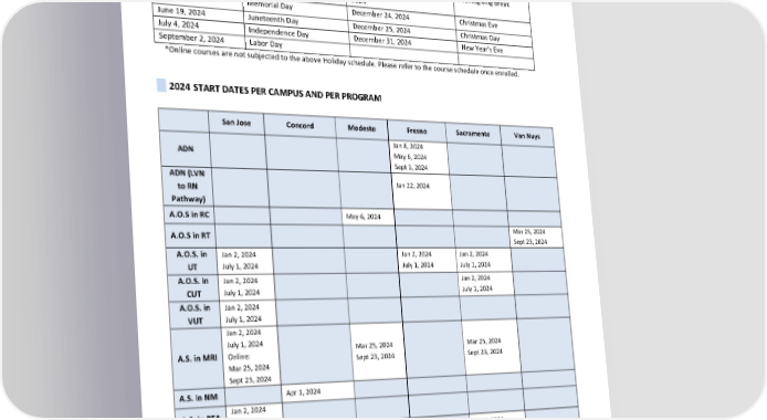 ACADEMIC CALENDAR 2024 HOLIDAYS FOR ALL CAMPUSES AND PROGRAMS* January 1, 2024 New Year's Day October 14, 2024 Indigenous Peoples’ Day January 15, 2024 Dr. Martin Luther King Jr. Day November 11, 2024 Veterans Day February 19, 2024 Presidents’ Day November 28 – November 29, Thanksgiving Break 2024 May 27, 2024 Memorial Day December 24, 2024 Christmas Eve June 19, 2024 Juneteenth Day December 25, 2024 Christmas Day July 4, 2024 Independence Day December 31, 2024 New Year's Eve September 2, 2024 Labor Day *Online courses are not subjected to the above Holiday schedule. Please refer to the course schedule once enrolled. 2024 START DATES PER CAMPUS AND PER PROGRAM San Jose Concord Modesto Fresno Sacramento Van Nuys Jan 8, 2024 ADN May 6, 2024 Sept 3, 2024 ADN (LVN Jan 22, 2024 to RN Pathway) A.O.S in RC May 6, 2024 A.O.S in RT Mar 25, 2024 Sept 23, 2024 A.O.S. in Jan 2, 2024 Jan 2, 2024 Jan 2, 2024 UT July 1, 2024 July 1, 2024 July 1, 2024 A.O.S. in Jan 2, 2024 Jan 2, 2024 CUT July 1, 2024 July 1, 2024 A.O.S. in Jan 2, 2024 VUT July 1, 2024 Jan 2, 2024 July 1, 2024 Mar 25, 2024 Mar 25, 2024 A.S. in MRI Online: Sept 23, 2024 Sept 23, 2024 Mar 25, 2024 Sept 23, 2024 A.S. in NM Apr 1, 2024 A.S. in PTA Jan 2, 2024 July 1, 2024 A.S. in RT July 1, 2024 July 1, 2024 Jan 8, 2024 A.S. in VN May 6, 2024 Sept 3, 2024 B.S. in DMI Jan 8, 2024 May 6, 2024 Revised by: Gurnick Academy of Medical Arts Process Department Page 51 of 60 Effective Dates: January 1, 2024, to December 31, 2024 Date of Revision: March 1, 2024