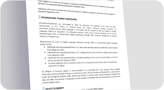 Individuals who were enrolled but never started a core program and wish to enroll again are considered new applicants after 270 days (9 months) from the initial start date and must pay the Registration Fee again. Gurnick Academy of MedicalArtsgraduateswhodesiretoenrollagainareconsiderednewapplicantsandmustalsopay theRegistration Fee. Individuals eligible to re-enroll are subject to pay the Registration Fee if re-enrollment occurs after 180 days of anapprovedwithdrawal/expulsion/completiondate. Those eligible to re-enroll are not subject to paying the $100.00 Registration Fee if re-enrollment occurs within 180daysofanapprovedwithdrawal/expulsion/completiondate. Individuals who want to transfer from one cohort group to a different program or time frame are not subject to paying the Registration Fee. INTERNATIONALSTUDENTADMISSIONS International applicants are encouraged to apply for admission. All applicants must meet the exact requirements as U.S. citizens as outlined above. An English evaluation should accompany all documents. Students whose native language is not English will be required to take the English as Foreign Language (TOEFL) or equivalent. The following minimum TOEFL scores must be obtained: 45 for the iBT (internet-based test) or demonstrate English proficiency through other measures established by Gurnick AcademyofMedicalArts. Requirements for proof of English Language Proficiency through TOEFL or International English Language System(IELTS): ● IndividualswhohavegraduatedfromaU.S.highschoolandhavepassedCAproficiencywillbeexempt fromtakingtheTOEFL. ● IndividualswhohavegraduatedfromaU.S.college/universitywithanAS/AAorhigherwillbeexempt fromtakingtheTOEFL. ● IndividualswhohavegraduatedfromanEnglish-speakingcountry,suchasCanada,Nigeria,ortheUK, will be exempt from taking the TOEFL. ● ForthoseoptingforIELTS,aminimumscoreof6.5isrequiredineachsection,withanoverallband score of 6.5 or higher. An affidavit of financial support is recommended to be submitted but is not required. More detailed information will be provided through our Admissions office. Gurnick Academy of Medical Arts is authorized to enroll non-immigrant students under federal law. Besides F1 and M1 visas, Gurnick Academy of Medical Arts does not offer visa services. If requested, Gurnick Academy of Medical Arts will document and vouch for the current student status. ABILITY TO BENEFIT Gurnick AcademyofMedicalArtsdoesnotacceptAbility-to-Benefit(ATB)students. ADMISSIONREQUIREMENTS The table below is only a summary of Admission Requirements. A complete list of admission requirements is presented in the General Admission Requirements for all programs, as well as Additional Admission Requirementsperprogram. 23