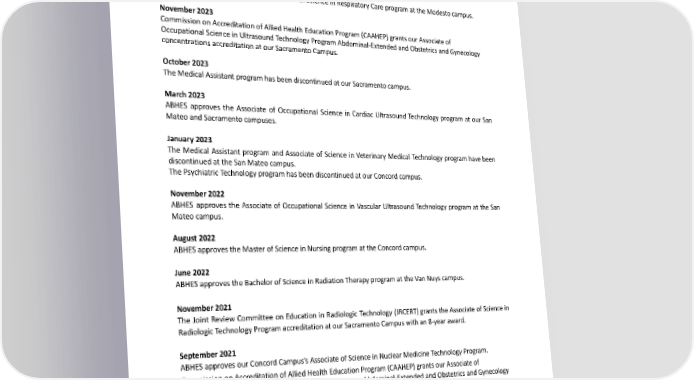 STATEMENTOFHISTORY&OWNERSHIP February2024 ABHESapprovestheBoneDensitometryTechnicianprogramattheSacramentocampus. December2023 ABHESapprovestheAssociateofOccupationalScienceinRespiratoryCareprogramattheModestocampus. November2023 CommissiononAccreditationofAlliedHealthEducationProgram(CAAHEP)grantsourAssociateof Occupational Science in Ultrasound Technology Program Abdominal-Extended and Obstetrics and Gynecology concentrations accreditation at our Sacramento Campus. October2023 TheMedicalAssistantprogramhasbeendiscontinuedatourSacramentocampus. March2023 ABHES approves the Associate of Occupational Science in Cardiac Ultrasound Technology program at our San MateoandSacramentocampuses. January2023 The Medical Assistant program and Associate of Science in Veterinary Medical Technology program have been discontinued at the San Mateo campus. ThePsychiatric Technology program has been discontinued at our Concord campus. November2022 ABHES approves the Associate of Occupational Science in Vascular Ultrasound Technology program at the San Mateocampus. August2022 ABHESapprovestheMasterofScienceinNursingprogramattheConcordcampus. June2022 ABHESapprovestheBachelorofScienceinRadiationTherapyprogramattheVanNuyscampus. November2021 The Joint Review Committee on Education in Radiologic Technology (JRCERT) grants the Associate of Science in Radiologic Technology Program accreditation at our Sacramento Campus with an 8-year award. September2021 ABHESapprovesourConcordCampus’sAssociateofScienceinNuclearMedicineTechnologyProgram. CommissiononAccreditationofAlliedHealthEducationProgram(CAAHEP)grantsourAssociateof Occupational Science in Ultrasound Technology Program Abdominal-Extended and Obstetrics and Gynecology concentrations accreditation at our San Mateo Campus. TheMedicalAssistantwithPhlebotomyprogramhasbeendiscontinuedatourConcordandFresnocampuses. June2021 ABHESapprovestheVocationalNurseProgramatourSacramentoCampus. 11