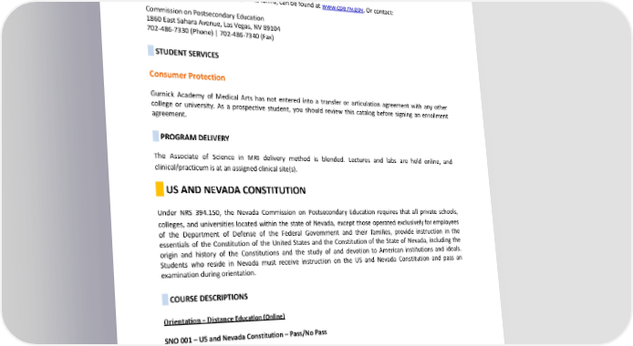 1. Afull refund can be ordered if it is determined that the school substantially failed to furnish the education agreed to in the enrollment contract; 2. One-half of all monies paid can be ordered if it is determined that the school substantially furnished theeducationstatedintheenrollmentcontract.Still, the conditions were substandard to the point the student could not be expected to complete the training. Moreinformation,includingcomplaintsforms,canbefoundatwww.cpe.nv.gov.Orcontact: CommissiononPostsecondaryEducation 1860EastSaharaAvenue,LasVegas,NV89104 702-486-7330(Phone)|702-486-7340(Fax) STUDENTSERVICES ConsumerProtection Gurnick Academy of Medical Arts has not entered into a transfer or articulation agreement with any other college or university. As a prospective student, you should review this catalog before signing an enrollment agreement. PROGRAMDELIVERY The Associate of Science in MRI delivery method is blended. Lectures and labs are held online, and clinical/practicum is at an assigned clinical site(s). USANDNEVADACONSTITUTION Under NRS 394.150, the Nevada Commission on Postsecondary Education requires that all private schools, colleges, and universities located within the state of Nevada, except those operated exclusively for employees of the Department of Defense of the Federal Government and their families, provide instruction in the essentials of the Constitution of the United States and the Constitution of the State of Nevada, including the origin and history of the Constitutions and the study of and devotion to American institutions and ideals. Students who reside in Nevada must receive instruction on the US and Nevada Constitution and pass an examinationduringorientation. COURSEDESCRIPTIONS Orientation–DistanceEducation(Online) SNO001–USandNevadaConstitution–Pass/NoPass Prerequisite: None The instruction on the United States Constitution and the Nevada State Constitution provides the student with the essentials of the two (2) Constitutions, which gives the learner an overview of the elements, similarities, anduniqueaspectsofeach. NOTE:PleasereviewtheattachedAddendumforanychangesandupdatesthatwemayhaveregardingour programsandtheAcademyasawhole. 325