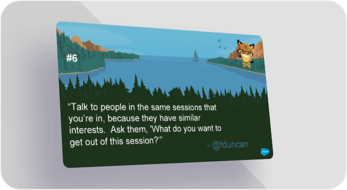 30 Really Good Pieces of Advice for Dreamforce First Timers Page 8 Page 10#6 “Talk to people in the same sessions that you’re in, because they have similar interests. Ask them, 'What do you want to get out of this session?’” - @fduncan