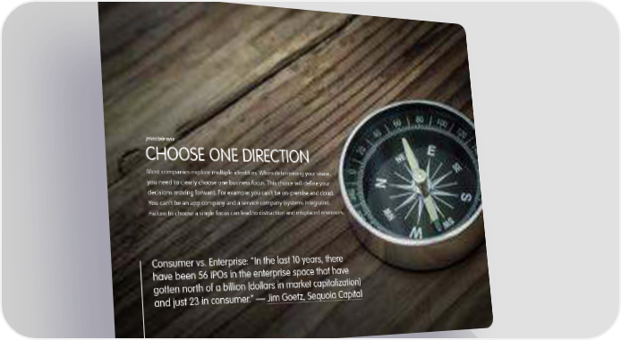 principle one CHOOSE ONE DIRECTION Most companies explore multiple identities. When determining your vision, you need to clearly choose one business focus. This choice will define your decisions moving forward. For example: you can’t be on- premise and cloud. You can’t be an app company and a service company (systems integrator). Failure to choose a single focus can lead to distraction and misplaced resources. Consumer vs. Enterprise: “In the last 10 years, there have been 56 IPOs in the enterprise space that have gotten north of a billion [dollars in market capitalization] and just 23 in consumer.” — Jim Goetz, Sequoia Capital