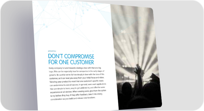 principle four DON’T COMPROMISE FOR ONE CUSTOMER Every company is lured towards closing a deal with that one big logo. This can be especially true for companies in the early stages of growth. Be careful not to fall too deeply in love with the idea of this customer, as it can lead you away from your initial focus and vision. Tailoring your product to meet that one customer’s specific needs can undermine its overall success. In general, users want applications that are simple to learn, easy to get addicted to, and offer the same experience on all devices. When wooing users, give them the option to try before they buy. If they offer feedback, take it into strong consideration as you build and release new iterations.