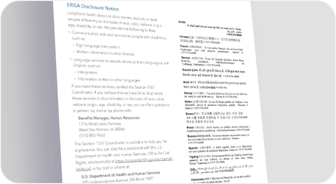 Availability of Summary Health Information UnityPoint Health offers two medical plans. As required by Patient Protection and Affordable Care Act, your plan makes available a Summary of Bene昀椀ts and Coverage (SBC) for each option. The SBCs can be found at the HR landing page on the Hub. You can also request a paper copy, free of charge, by contacting AskHR ERISA Disclosure Notice UnityPoint Health does not discriminate, exclude, or treat Arabic ERISA Disclosure Notice people differently on the basis of race, color, national origin, ك ﻟ ر ﻓ ا و ﺗ ﺗ ﺔ ﯾ و ﻐ ﻠ ﻟ ا ة د ﻋ ﺎ ﺳ ﻣ ﻟ ا ت ﺎ ﻣ د ﺧ ن ﺈ ﻓ ، ﺔ ﻐ ﻠ ﻟ ا ر ﻛ ذ ا ث د ﺣ ﺗ ﺗ ت ﻧ ﻛ ا ذ إ : ﺔ وظ ﺣ ﻠ ﻣ م ﻗ ر ﺑ ﺻل ﺗ ا . ن ﺎ ﻣﺟ ﻟ ﺎ ﺑ UnityPoint Health does not discriminate, exclude, or age, disability, or sex. We provide the following for free: 1-515-574-6608 treat people differently on the basis of race, color, 注意:如果您使用繁體中文,您可以免費獲得語 Chinese › national origin, age, disability, or sex. We provide the C ommunication aids and services to people with disabilities, 言援助服務。請致電 1-515-574-6608。 such as: following for free: • Communication aids and services to people with French ATTENTION : Si vous parlez français, des services d’aide – Sign language interpreters linguistique vous sont proposés gratuitement. Appelez le disabilities, such as: o Sign language interpreters 1-515-574-6608. – Written information in other formats German ACHTUNG: Wenn Sie Deutsch sprechen, stehen Ihnen › o Written information in other formats kostenlos sprachliche Hilfsdienstleistungen zur Language services to people whose primary language is not Verfügung. Rufnummer: 1-515-574-6608. English, such as: • Language services to people whose primary ુ ુ ુ Gujarati !ચના: જો તમે -જરાતી બોલતા હો, તો િન:56ક ભાષા સહાય language is not English, such as: ? – Interpreters o Interpreters સેવાઓ તમારા માટ ઉપલBધ છે. ફોન કરો 1-515-574-6608. – Information written in other languages o Information written in other languages Hindi !यान द': य)द आप ,हदं ी बोलते ह 5 तो आपके िलए मु;त म' भाषा सहायता If you need these services, contact the Section 1557 सेवाएं उपलAध ह।5 1-515-574-6608 पर कॉल कर'। If you need these services, contact the Grievance Coordinator. If you believe that we have failed to Coordinator. If you believe that we have failed to provide Hmong LUS CEEV: Yog tias koj hais lus Hmoob, cov kev pab txog lus, muaj kev pab dawb rau koj. Hu rau 1-515-574-6608. provide these services or discriminated on the basis these services or discriminated on the basis of race, color, Italian ATTENZIONE: In caso la lingua parlata sia l’italiano, sono of race, color, national origin, age, disability, or sex, national origin, age, disability, or sex, you can 昀椀le a grievance disponibili servizi di assistenza linguistica gratuiti. Chiamare il you can file a grievance in person, by mail or by in person, by mail or by phone with: numero 1-515-574-6608. phone with: 주의: 한국어를 사용하시는 경우, 언어 지원 Korean Bene昀椀ts Manager, Human Resources 서비스를 무료로 이용하실 수 있습니다. 1-515-574-6608 Benefits Manager, Human Resources 1776 West Lakes Parkway 번으로 전화해 주십시오. 1776 West Lakes Parkway West Des Moines, IA 50266 Polish UWAGA: Jeżeli mówisz po polsku, możesz skorzystać z West Des Moines, IA 50266 (515) 883-9662 bezpłatnej pomocy językowej. Zadzwoń pod numer 1-515-574-6608. (515) 883-9662 Russian ВНИМАНИЕ: Если вы говорите на русском языке, то The Section 1557 Coordinator is available to help you 昀椀le вам доступны бесплатные услуги перевода. Звоните 1-515-574-6608. The Grievance Coordinator is available to help you a grievance. You can also 昀椀le a complaint with the U.S. file a grievance. You can also file a complaint with the Spanish ATENCIÓN: si habla español, tiene a su disposición Department of Health and Human Services, Of昀椀ce for Civil servicios gratuitos de asistencia lingüística. Llame al 1-515-574-6608. U.S. Department of Health and Human Services, Office Tagalog PAUNAWA: Kung nagsasalita ka ng Tagalog, maaari kang for Civil Rights, electronically at Rights, electronically at https://ocrportal.hhs.gov/ocr/portal/ gumamit ng mga serbisyo ng tulong sa wika nang walang https://ocrportal.hhs.gov/ocr/portal/lobby.jsf, or by lobby.jsf, or by mail or phone at: bayad. Tumawag sa 1-515-574-6608. mail or phone at: ت ﺎ ﻣ د ﺧ ﯽ ﮐ د د ﻣ ﯽ ﮐ ن ﺎ ﺑ ز و ﮐ پ آ و ﺗ ، ں ﯾ ﮨ ﮯ ﺗ ﻟ و ﺑ و د ر ا پ آ ر ﮔ ا : ر ا رد ﺑ U.S. Department of Health and Human Services Urdu . ﯾں ر ﮐ ل ﺎ ﮐ ۔ ﯾں ﮨ ب ﺎ ﯾ ﺗ ﺳ د ﯾں ﻣ ت ﻔ ﻣ 1-515-574-6608 . 200 Independence Avenue, SW Room 509F Vietnamese CHÚ Ý: Nếu bạn nói Tiếng Việt, có các dịch vụ hỗ trợ HHH Building U.S. Department of Health and Human Services 200 ngôn ngữ miễn phí dành cho bạn. Gọi số Independence Avenue, SW Room 509F, Washington, D.C. 20201 1-515-574-6608. HHH Building 1-800-368-1019 | 1-800-537-7697 (TDD) Washington, D.C. 20201 Complaint forms are available at 1-800-368-1019, http://www.hhs.gov/ocr/of昀椀ce/昀椀le/index.html 1-800-537-7697 (TDD) Complaint forms are available at http://www.hhs.gov/ocr/office/file/index.html | 48 |
