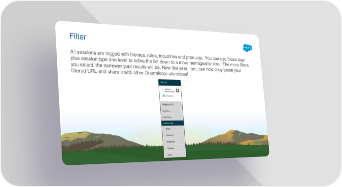 Filter All sessions are tagged with themes, roles, industries and products. You can use these tags plus session type and level to refine the list down to a more manageable size. The more filters you select, the narrower your results will be. New this year - you can now copy/paste your filtered URL and share it with other Dreamforce attendees!