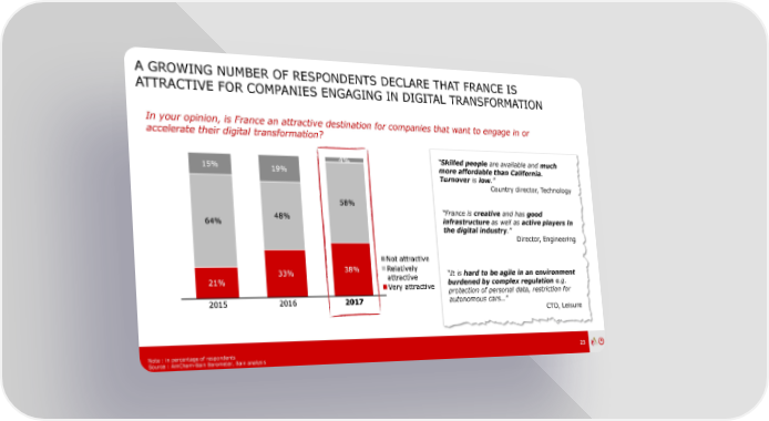 A GROWING NUMBER OF RESPONDENTS DECLARE THAT FRANCE IS ATTRACTIVE FOR COMPANIES ENGAGING IN DIGITAL TRANSFORMATION In your opinion, is France an attractive destination for companies that want to engage in or accelerate their digital transformation? “Skilled people are available and much more affordable than California. Turnover is low.” Country director, Technology “France is creative and has good infrastructure as well as active players in the digital industry.” Director, Engineering “It is hard to be agile in an environment burdened by complex regulation e.g. protection of personal data, restriction for autonomous cars…” CTO, Leisure Note : in percentage of respondents 23 Source : AmCham-Bain Barometer, Bain analysis