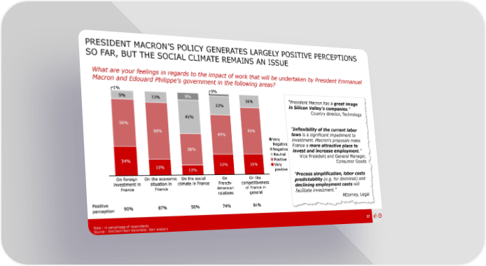 PRESIDENT MACRON’S POLICY GENERATES LARGELY POSITIVE PERCEPTIONS SO FAR, BUT THE SOCIAL CLIMATE REMAINS AN ISSUE What are your feelings in regards to the impact of work that will be undertaken by President Emmanuel Macron and Edouard Philippe’s government in the following areas? “President Macron has a great image in Silicon Valley's companies.” Country director, Technology “Inflexibility of the current labor laws is a significant impediment to investment. Macron's proposals make France a more attractive place to invest and increase employment.” Vice President and General Manager, Consumer Goods “Process simplification, labor costs predictability (e.g. for dismissal) and declining employment costs will facilitate investment.” Attorney, Legal Note : in percentage of respondents 27 Source : AmCham-Bain Barometer, Bain analysis