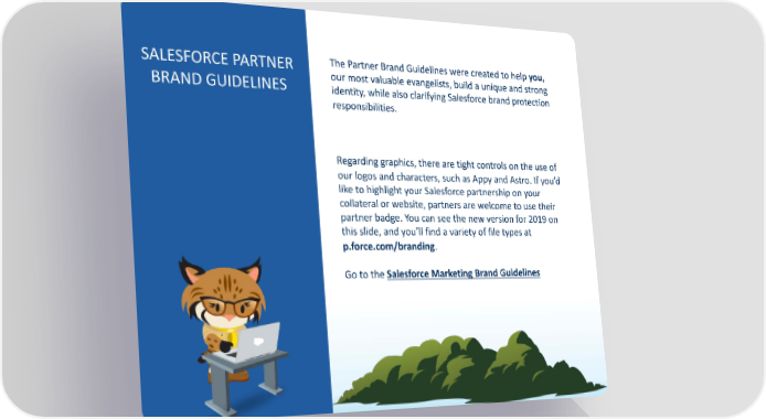 SALESFORCE PARTNER The Partner Brand Guidelines were created to help you, BRAND GUIDELINES our most valuable evangelists, build a unique and strong identity, while also clarifying Salesforce brand protection responsibilities. Regarding graphics, there are tight controls on the use of our logos and characters, such as Appy and Astro. If you’d like to highlight your Salesforce partnership on your collateral or website, partners are welcome to use their partner badge. You can see the new version for 2019 on this slide, and you’ll find a variety of file types at p.force.com/branding. Go to the Salesforce Marketing Brand Guidelines