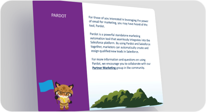 PARDOT For those of you interested in leveraging the power of email for marketing, you may have heard of the tool, Pardot. Pardot is a powerful standalone marketing automation tool that seamlessly integrates into the Salesforce platform. By using Pardot and Salesforce together, marketers can automatically create and assign qualified new leads in Salesforce. For more information and questions on using Pardot, we encourage you to collaborate with our Partner Marketing group in the community.