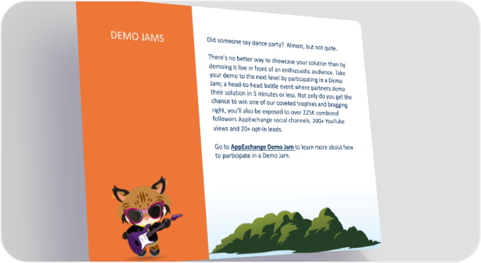 DEMO JAMS Did someone say dance party? Almost, but not quite. There's no better way to showcase your solution than by demoing it live in front of an enthusiastic audience. Take your demo to the next level by participating in a Demo Jam; a head-to-head battle event where partners demo their solution in 3 minutes or less. Not only do you get the chance to win one of our coveted trophies and bragging right, you’ll also be exposed to over 225K combined followers AppExchange social channels, 200+ YouTube views and 20+ opt-in leads. Go to AppExchange Demo Jam to learn more about how to participate in a Demo Jam.