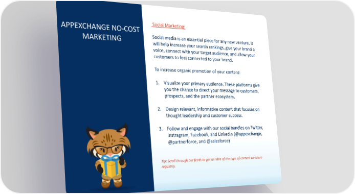 APPEXCHANGE NO-COST Social Marketing: MARKETING Social media is an essential piece for any new venture. It will help increase your search rankings, give your brand a voice, connect with your target audience, and allow your customers to feel connected to your brand. To increase organic promotion of your content: 1. Visualize your primary audience. These platforms give you the chance to direct your message to customers, prospects, and the partner ecosystem. 2. Design relevant, informative content that focuses on thought leadership and customer success. 3. Follow and engage with our social handles on Twitter, Instragram, Facebook, and Linkedin (@appexchange, @partnerforce, and @salesforce) Tip: Scroll through our feeds to get an idea of the type of content we share regularly.