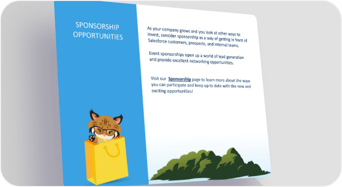 SPONSORSHIP As your company grows and you look at other ways to OPPORTUNITIES invest, consider sponsorship as a way of getting in front of Salesforce customers, prospects, and internal teams. Event sponsorships open up a world of lead generation and provide excellent networking opportunities. Visit our Sponsorship page to learn more about the ways you can participate and keep up to date with the new and exciting opportunities!
