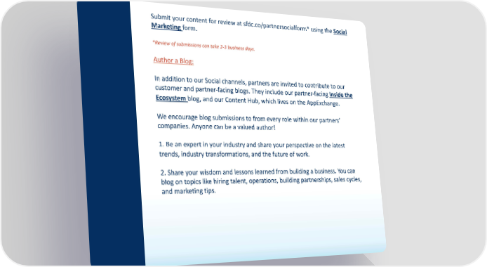 Submit your content for review at sfdc.co/partnersocialform* using the Social Marketing form. *Review of submissions can take 2-3 business days. Author a Blog: In addition to our Social channels, partners are invited to contribute to our customer and partner-facing blogs. They include our partner-facing Inside the Ecosystem blog, and our Content Hub, which lives on the AppExchange. We encourage blog submissions to from every role within our partners’ companies. Anyone can be a valued author! 1. Be an expert in your industry and share your perspective on the latest trends, industry transformations, and the future of work. 2. Share your wisdom and lessons learned from building a business. You can blog on topics like hiring talent, operations, building partnerships, sales cycles, and marketing tips.