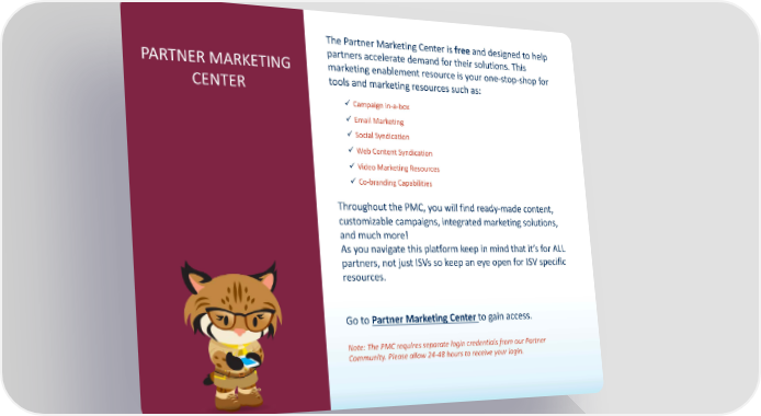 The Partner Marketing Center is free and designed to help partners accelerate demand for their solutions. This PARTNER MARKETING marketing enablement resource is your one-stop-shop for CENTER tools and marketing resources such as: üCampaign in-a-box üEmail Marketing üSocial Syndication üWeb Content Syndication üVideo Marketing Resources üCo-branding Capabilities Throughout the PMC, you will find ready-made content, customizable campaigns, integrated marketing solutions, and much more! As you navigate this platform keep in mind that it’s for ALL partners, not just ISVs so keep an eye open for ISV specific resources. Go to Partner Marketing Center to gain access. Note: The PMC requires separate login credentials from our Partner Community. Please allow 24-48 hours to receive your login.