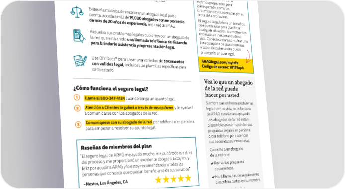 ¿Por qué debería adquirir un seguro legal? ¿䔀渀 焀甀é 瀀甀攀搀e Al acudir con un abogado de la red, sus honorarios estarán 愀礀u搀愀爀氀e 甀渀 pagados al 100% en la mayoría de los asuntos cubiertos. 猀攀最甀爀漀 氀攀最愀l? Ahorre miles de dólares en promedio por cada asunto La mayoría de nosotros no legal, al evitar los costosos honorarios legales.* estamos preparados para lo inesperado, como las circunstancias ocasionadas por el Evítese la molestia de encontrar un abogado local por su brote del coronavirus. cuenta: acceda a más de 15,000 abogados con un promedio El seguro legal brinda un bene昀椀cio de más de 20 años de experiencia, en la red de ARAG. que puede usar para plani昀椀car cualquier situación: los momentos esperados e inesperados de su Resuelva sus problemas legales cubiertos con un abogado de vida. Conéctese para consultar una la red que está a solo una llamada telefónica de distancia lista completa de las coberturas para brindarle asistencia y representación legal. y saber de qué manera puede protegerlo un plan legal. Use DIY Docs® para crear una variedad de documentos ARAGlegal.com/myinfo con validez legal, incluidas las plantillas especí昀椀cas para Código de acceso: 18191uph cada estado. Vea lo que un abogado ¿Cómo funciona el seguro legal? de la red puede 1 hacer por usted Llame al 800-247-4184 cuando tenga un asunto legal. Siempre que enfrente problemas 2 Atención a Clientes lo guiará a través de sus opciones y le ayudará legales en su vida, su cobertura a comunicarse con los abogados de la red. de ARAG estará para apoyarlo. 3 Comuníquese con su abogado de la red por teléfono o en persona Los abogados de la red están para empezar a resolver su asunto legal. disponibles para responder sus preguntas legales en persona o por teléfono para atender Reseñas de miembros del plan sus necesidades inmediatas. "El seguro legal de ARAG me ayudó mucho, me quitó todo el estrés Consulte a un abogado del proceso y me proporcionó un excelente abogado. Estoy muy de la red que: feliz por acudir a ARAG y lo estoy recomendando a todas las Revisará o preparará personas que conozco que puedan bene昀椀ciarse de sus servicios" documentos. – Nestor, Los Ángeles, CA Hará llamadas de seguimiento o escribirá cartas en su nombre. Le aconsejará sobre problemas legales. *El costo promedio para los empleados sin seguro legal se basa en la cantidad promedio de horas de trabajo de los abogados en los reclamos de ARAG producidos en 2018 o 2019, y que se pagaron antes del 31 de Lo representará, incluso si diciembre de 2020, multiplicado por $368 por hora. La tarifa promedio por hora de los honorarios que cobra un abogado de Estados Unidos que tiene de 11 a 15 años de experiencia es de $368, de acuerdo con "The se presenta en un tribunal. Survey of Law Firm Economics: 2018 Edition" Se aplican limitaciones y exclusiones. Dependiendo de la legislación estatal, el seguro legal de ARAG puede considerarse un producto de seguros o un producto de servicios. Los productos relacionados con los seguros están suscritos por ARAG Insurance Company de Des Moines, Iowa. Los productos relacionados con los servicios son proporcionados por ARAG Services, LLC. Este material es únicamente para fines ilustrativos y no es un contrato. Para conocer los términos, los beneficios o las exclusiones, llame a nuestro número de teléfono sin costo. © 2021 ARAG North America, Inc. Rev 6/21 200332uph