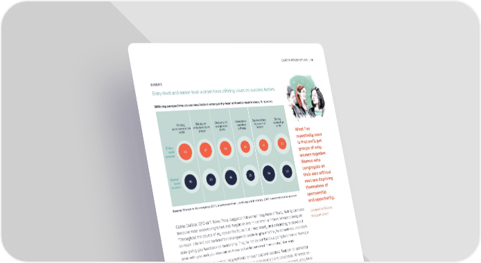 CAREER PERSPECTIVES | 13 Exhibit 5 Entry-level and senior-level women have differing views on success factors. Differing perspectives on success factors among entry-level and senior-level women, % agreeing Strong Being an Delivery of Innovative Sponsorship Strong communication effective team exceptional problem by a senior leadership skills player skills solving leader skills What I’ve Entry- repeatedly seen level 54 47 44 32 31 30 is that we’ll get women groups of only women together. Women who Senior- congregate on level 45 29 48 25 56 39 women their own without men are depriving themselves of Source: Women in the workplace 2017, a joint report from LeanIn.org and McKinsey, 2017, womenintheworkplace.com sponsorship and opportunity. Céline Dufétel, CFO at T. Rowe Price, suggests that women may have difficulty finding sponsors Jacqueline Molnar, because male leaders might feel that they have less in common with their female colleagues. Western Union “Throughout the course of my career I’ve found it at times lonely and exhausting to stand out so much. I think it can be hard for colleagues to relate to you and they’re sometimes uncomfort- able giving you feedback or mentorship. They’re not as comfortable going to dinner or having a drink with you and you miss out on those valuable personal interactions,” she says. In addition, entry-level women may not insist on such support because they do not yet recog- nize the importance of cultivating a strong network of supporters and advocates. Whereas se- nior-level women come to view sponsorship as the factor most essential to success, entry-level women believe that performance is the strongest driver of advancement. They tend to view strong communication skills, being an effective team player, and delivering exceptional results as the most important factors of success (Exhibit 5). This failure to recognize the significance of sponsorship is exacerbated by the fact that the vast majority—81 percent—of entry-level women in financial services cultivate networks that are largely female or evenly split between males and females. In contrast, 94 percent of entry-level men cultivate networks that are largely male or evenly split between males and females. The fact that entry-level women skew toward women in their networks can impact their opportunities down the line. As these women progress through their careers, their networks will have fewer and fewer women who can serve as sponsors, since the upper levels of corporate management are predominantly male.