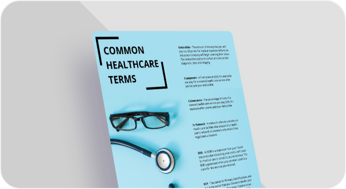 Deductible - The amount of money that you will pay out of pocket for medical expenses before the insurance company will begin covering their share. The deductible applies to certain procedures like diagnostic tests and imaging. Copayment - A fixed amount ($20, for example) you pay for a covered health care service after you've paid your deductible. Coinsurance - The percentage of costs of a covered health care service you pay (20%, for example) after you've paid your deductible. EOB - An EOB is a statement from your health insurance plan describing what costs it will cover for medical care or products you’ve received. The EOB is generated when your provider submits a claim for the services you received. In Network - In network refers to providers or health care facilities that are part of a health plan's network of providers with which it has negotiated a discount. Out-of-Network - This means that a doctor or physician does not have a contract with your health insurance plan provider. This can sometimes result in higher prices. PCP - This stands for Primary Care Physician, and this is the doctor that you choose to see for your annual physical and office visits. If you're on an HMO plan, this doctor will provide referrals to specialists when needed. Specialist - These are doctors who practice a specific type of medicine, like a dermatologist, chiropractor, or a cardiologist, for example. COMMON HEALTHCARE TERMS