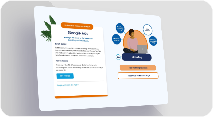 Boost Your Drive Salesforce Trademark Usage Marketing Demand Strategy Google Ads Leverage the power of the Salesforce Build Brand Optimize Your Awareness AppExchange brand in your Google Ads. Listing Benefit Details: Summit consulting partners can take advantage of this benefit to help promote Salesforce products and solutions on Google, YouTube and in other online advertising locations. Use ads incorporating the Salesforce trademark to help you attract new customers. Marketing How To Access: Please log a Benefits & Tools case via the Partner Community confirming that you are a Consulting partner and include your Google Free Marketing Resources ad master ID. GET STARTED Salesforce Trademark Usage Google Ads Benefit One Pager >