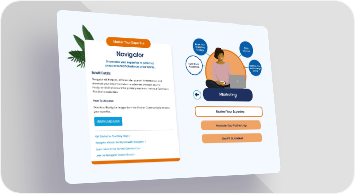 Market Your Expertise Boost Your Drive Marketing Demand Strategy Navigator Showcase your expertise to potential Build Brand Optimize Your Awareness AppExchange prospects and Salesforce sales teams. Listing Benefit Details: Navigator will help you differentiate yourself in the market and showcase your expertise to both customers and sales teams. Navigator distinctions are the primary way to market your Salesforce Practice’s capabilities. Marketing How To Access: Download Navigator badges from the Partner Community to market your expertise. Market Your Expertise DOWNLOAD NOW Promote Your Partnership Get Started in Four Easy Steps > Navigator eBook: Go Beyond with Navigator > Get PR Guidelines Learn more in the Partner Community > Join the Navigator Chatter Group >
