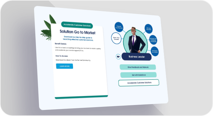 Accelerate Customer Solutions Promote Hire and Your Business Train Staff Solution Go to Market Grow Your Manage Your Download our step-by-step guide to Business Partnership launching effective customer solutions. and Benefits Benefit Details: Use this e-book as roadmap to bring your solutions to market quickly Get Started and accelerate your service opportunities. as a Partner How To Access: Business Leader Download the eBook from the Partner Community. LEARN MORE Give Feedback and Network Sell with Salesforce Accelerate Customer Solutions