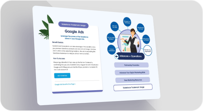 Manage Your Partnership Hire and Utilize Benefits Salesforce Trademark Usage Train Staff and Tools Google Ads Leverage the power of the Salesforce Get Your Apps Getting Started brand in your Google Ads. Published as a Partner Benefit Details: Summit level Consultants can take advantage of this benefit to help you promote Salesforce products and solutions on Google, YouTube, Product Promote Your and in other online advertising locations. Use ads incorporating the Enablement Organization Salesforce trademark to help you attract new customers. Alliances + Operations How To Access: Please log a Benefits & Tools case via the Partner Community confirming that you are a Summit Consulting partner and include your Partnership Promotion Google ad ID. Please ensure that the ID you provide is the master ID, not a sub-account ID Advance Your Digital Marketing Skills GET STARTED Free Marketing Resources Google Ads Benefits One Pager > Salesforce Trademark Usage