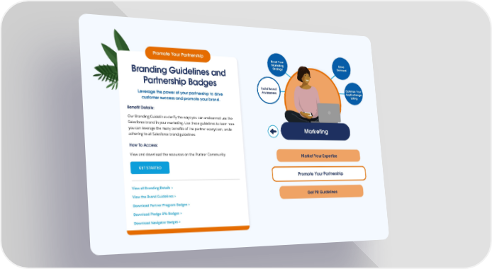 Promote Your Partnership Boost Your Drive Marketing Demand Strategy Branding Guidelines and Partnership Badges Build Brand Optimize Your Awareness AppExchange Leverage the power of your partnership to drive Listing customer success and promote your brand. Benefit Details: Our Branding Guidelines clarify the ways you can and cannot use the Salesforce brand in your marketing. Use these guidelines to learn how you can leverage the many benefits of the partner ecosystem, while Marketing adhering to all Salesforce brand guidelines How To Access: View and download the resources on the Partner Community. Market Your Expertise GET STARTED Promote Your Partnership View all Branding Details > View the Brand Guidelines > Get PR Guidelines Download Partner Program Badges > Download Pledge 1% Badges > Download Navigator Badges >