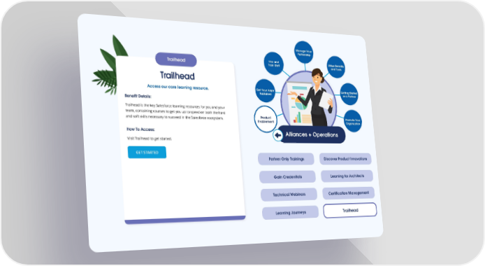 Manage Your Partnership Hire and Utilize Benefits Trailhead Train Staff and Tools Trailhead Access our core learning resource. Get Your Apps Getting Started Published as a Partner Benefit Details: Trailhead is the key Salesforce learning resources for you and your team, containing courses to get you up to speed on both the hard and soft skills necessary to succeed in the Salesforce ecosystem. Product Promote Your Enablement Organization How To Access: Alliances + Operations Visit Trailhead to get started. GET STARTED Partner Only Trainings Discover Product Innovations Gain Credentials Learning for Architects Technical Webinars Certification Management Learning Journeys Trailhead