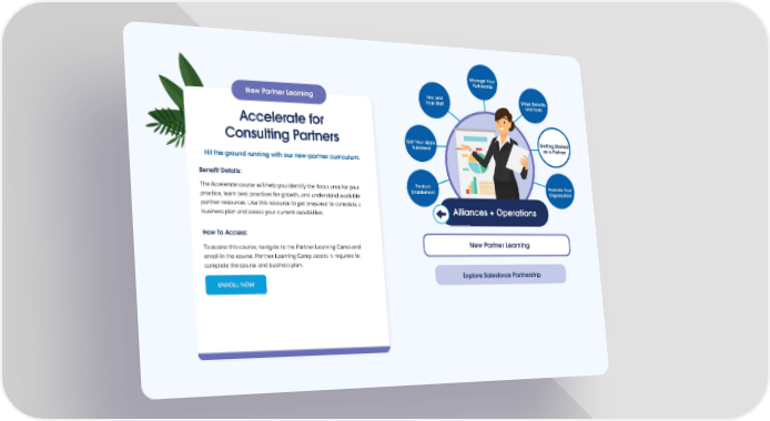 Manage Your Partnership New Partner Learning Hire and Utilize Benefits Train Staff and Tools Accelerate for Consulting Partners Get Your Apps Getting Started Published as a Partner Hit the ground running with our new-partner curriculum. Benefit Details: The Accelerate course will help you identify the focus area for your Product Promote Your Enablement Organization practice, learn best practices for growth, and understand available partner resources. Use this resource to get prepared to complete a business plan and assess your current capabilities. Alliances + Operations How To Access: To access this course, navigate to the Partner Learning Camp and New Partner Learning enroll in the course. Partner Learning Camp access is required to complete the course and business plan. Explore Salesforce Partnership ENROLL NOW