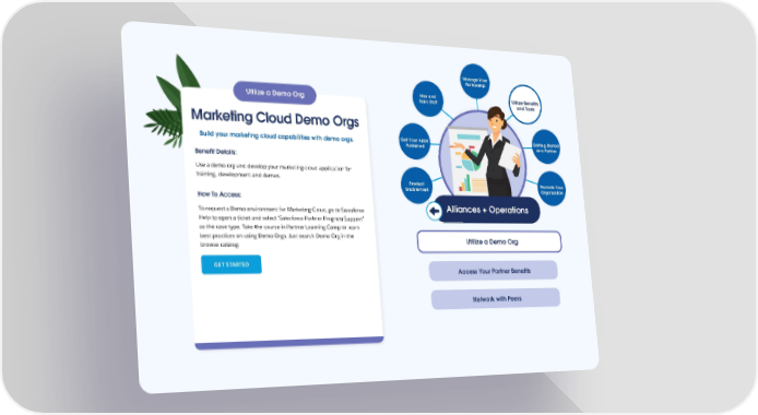 Manage Your Partnership Hire and Utilize Benefits Utilize a Demo Org Train Staff and Tools Marketing Cloud Demo Orgs Build your marketing cloud capabilities with demo orgs. Get Your Apps Getting Started Published as a Partner Benefit Details: Use a demo org and develop your marketing cloud application for training, development and demos. Product Promote Your Enablement Organization How To Access: To request a Demo environment for Marketing Cloud, go to Salesforce Alliances + Operations Help to open a ticket and select ‘Salesforce Partner Program Support’ as the case type. Take the course in Partner Learning Camp to learn best practices on using Demo Orgs. Just search Demo Org in the Utilize a Demo Org browse catalog. GET STARTED Access Your Partner Benefits Network with Peers