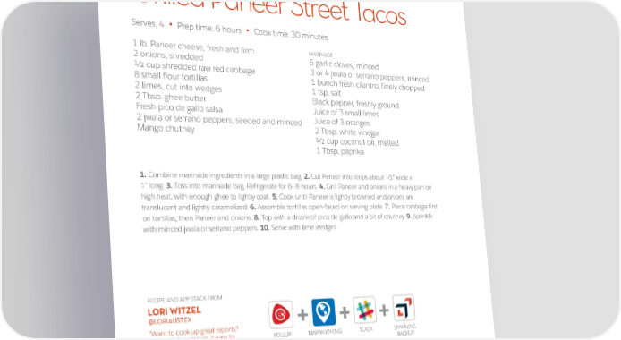 Grilled Paneer Street Tacos Serves: 4 Prep time: 6 hours Cook time: 30 minutes • • 1 lb. Paneer cheese, fresh and firm MARINADE 2 onions, shredded 6 garlic cloves, minced 3 or 4 jwala or serrano peppers, minced 1/2 cup shredded raw red cabbage 1 bunch fresh cilantro, finely chopped 8 small flour tortillas 2 limes, cut into wedges 1 tsp. salt 2 Tbsp. ghee butter Black pepper, freshly ground Fresh pico de gallo salsa Juice of 3 small limes 2 jwala or serrano peppers, seeded and minced Juice of 3 oranges Mango chutney 2 Tbsp. white vinegar 1/2 cup coconut oil, melted 1 Tbsp. paprika 1. Combine marinade ingredients in a large plastic bag. 2. Cut Paneer into strips about 1/2" wide x 1" long. 3. Toss into marinade bag. Refrigerate for 6–8 hours. 4. Grill Paneer and onions in a heavy pan on high heat, with enough ghee to lightly coat. 5. Cook until Paneer is lightly browned and onions are translucent and lightly caramelized. 6. Assemble tortillas open-faced on serving plate. 7. Place cabbage first on tortillas, then Paneer and onions. 8. Top with a drizzle of pico de gallo and a bit of chutney. 9. Sprinkle with minced jwala or serrano peppers. 10. Serve with lime wedges. RECIPE AND APP STACK FROM LORI WITZEL @LORIAUSTEX + + + “Want to cook up great reports? Rollup Helper makes it easy to ROLLUP MAPANYTHING SLACK SPANNING run them, Slack shares them, HELPER BACKUP and Spanning backs them up.” 18