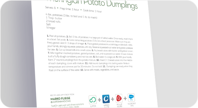 Thuringian Potato Dumplings Serves: 8 Prep time: 1 hour Cook time: 1 hour • • 4 lbs. potatoes (3 lbs. to boil and 1 lb. to mash) 1 Tbsp. butter 2 bread rolls Salt Vinegar 1. Peel all potatoes. 2. Boil 3 lbs. of potatoes in a large pot of salted water. Once ready, mash them in a bowl. Set aside. 3. Grate remaining potatoes (1 lb.) in a food processor. Make sure they are finely grated. Add 2–3 drops of vinegar. 4. Place grated potatoes in a cloth bag or dishcloth. With your hands, strongly squeeze potatoes until dry. Reserve squeezed-out water and grated potatoes for later. 5. Cut up bread rolls into small cubes. 6. Fry bread cubes with butter until golden brown. 7. Mix together mashed potatoes, grated potatoes, salt, and squeezed-out water. Ensure mixture is of a fluffy dough consistency and not too wet. 8. Boil water in a large pot. 9. With your hands, form 2" round dumplings from the potato mixture. 10. Insert 2–3 bread cubes into the middle of each dumpling, cover with mixture. 11. Add round dumplings into boiling water. Reduce temperature and simmer pot for 20 minutes. Do not boil. 12. Dumplings are ready when they float on the surface of the water. 13. Serve with meats, vegetables, and sauce. RECIPE AND APP STACK FROM MARKO FLIEGE @JUSTONINVOICING + + + “JustOn pairs well with these solutions to roll-up Salesforce data, create JUSTON APPERO ROLLUP SALESFORCE sophisticated quotes and proposals, QUOTE HELPER CPQ and automate billing processes.” 7