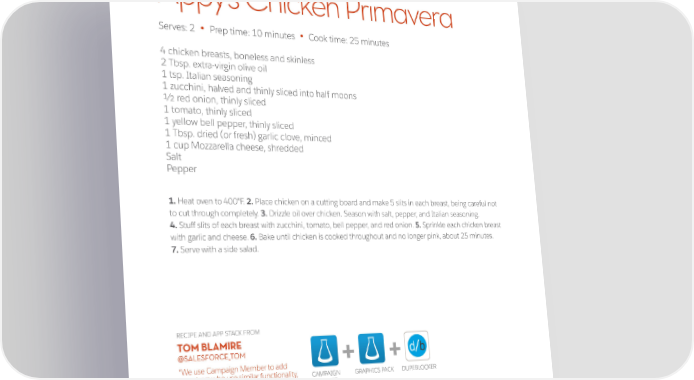 Appy’s Chicken Primavera Serves: 2 Prep time: 10 minutes Cook time: 25 minutes • • 1 1/2 lbs. pork tenderloin 4 chicken breasts, boneless and skinless 2 Tbsp. extra-virgin olive oil 1 tsp. Italian seasoning 1 zucchini, halved and thinly sliced into half moons 1/2 red onion, thinly sliced 1 tomato, thinly sliced 1 yellow bell pepper, thinly sliced 1 Tbsp. dried (or fresh) garlic clove, minced 1 cup Mozzarella cheese, shredded Salt Pepper 1. Heat oven to 400°F. 2. Place chicken on a cutting board and make 5 slits in each breast, being careful not to cut through completely. 3. Drizzle oil over chicken. Season with salt, pepper, and Italian seasoning. 4. Stuff slits of each breast with zucchini, tomato, bell pepper, and red onion. 5. Sprinkle each chicken breast with garlic and cheese. 6. Bake until chicken is cooked throughout and no longer pink, about 25 minutes. 7. Serve with a side salad. RECIPE AND APP STACK FROM TOM BLAMIRE @SALESFORCE_TOM + + “We use Campaign Member to add members who use similar functionality, CAMPAIGN GRAPHICS PACK DUPEBLOCKER Graphics Pack to visualize values, and MEMBER Dupeblocker to block dupes.” 17