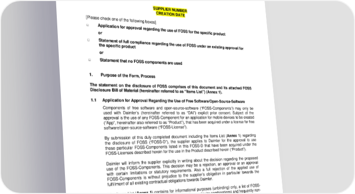 Document on FOSS-Disclosure Disclosure of Free Software and Open-Source-Software (FOSS) in App [NAME OF THE SUPPLIER ADDRESS ADDRESS] SUPPLIER NUMBER CREATION DATE [Please check one of the following boxes] □ Application for approval regarding the use of FOSS for the specific product or □ Statement of full compliance regarding the use of FOSS under an existing approval for the specific product or □ Statement that no FOSS components are used 1. Purpose of the Form, Process The statement on the disclosure of FOSS comprises of this document and its attached FOSS Disclosure Bill of Material (hereinafter referred to as “Items List”) (Annex 1). 1.1 Application for Approval Regarding the Use of Free Software/Open-Source-Software Components of free software and open-source-software (“FOSS-Components”) may only be used with Daimler’s (hereinafter referred to as “DAI”) explicit prior consent. Subject of the approval is the use of any FOSS-Component for an application for mobile devices to be created (“App”, hereinafter also referred to as “Product”), that has been acquired under a license for free software/open-source-software (“FOSS-License”). By submission of this duly completed document including the Items List (Annex 1) regarding the disclosure of FOSS (“FOSS-D”), the supplier applies to Daimler for the approval to use those particular FOSS-Components listed in this FOSS-D that have been acquired under the FOSS-Licenses described herein for the use in the Product described herein (“Product”). Daimler will inform the supplier explicitly in writing about the decision regarding the proposed use of the FOSS-Components. This decision may be a rejection, an approval or an approval with certain limitations or statutory requirements. Also a full rejection of the applied use of FOSS-Components is without prejudice to the supplier’s obligation in particular towards the fulfillment of all existing contractual obligations towards Daimler. The Items List (Annex 1) contains for informational purposes (unbinding) only, a list of FOSS- Licenses frequently approved by Daimler (including particular combinations) and frequently non- approved FOSS-Licenses. The current version of this FOSS-License list is also available under [add address for download of the current FOSS-License list]. From the content of the FOSS- License list no entitlement or claim for an approval of a FOSS-Component or FOSS-License by Daimler may be derived. 1.2 Statement of Unreserved Compliance with the Granted Approval With every delivery of the Product the supplier will by submission of this duly completed FOSS- D confirm without restriction or limitation that the Product fully complies with Daimler’s approval FOSS Disclosure Doc for Apps_2013-12-11_engl.docx Page 1 of 6