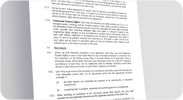 8 Startup adVANce | Cooperation Agreement solely for the purpose of the Startup adVANce Challenge and in accordance with this Agreement. 3.7.5 In addition to the rights of Daimler to the Startup-Background-IP as set forth in clause 3.7.4, Daimler shall be entitled to use the Startup-Background-IP to the extent necessary to use and otherwise exploit the Jointly-owned Work Results pursuant to clause 3.9.4. 3.7.6 If Background-IP is licensed from a third party, the obligation of the Party set forth in clause 3.7.4 and the obligation of the Startup set forth in clause 3.7.5 are subject to any restrictions that may be set forth in the license terms of the existing agreement with the third party. The other Party is obligated to comply with these license terms, provided that these have been disclosed in advance to this other Party. 3.7.7 During the term of this Agreement (cf. clause 3.18), the Startup is not entitled to transfer its Startup-Background-IP to a third party or to grant an exclusive license thereto for purposes similar to the Product Idea, the Concept and the Prototypes, respectively, if this adversely affects Daimler’s rights thereto pursuant to this Agreement. 3.7.8 "Intellectual Property Rights" shall mean the following: any rights existing out of, to, or in intangible assets, including, without limitation, patents, utility models, inventions (whether or not patentable), trade and business secrets, know-how, copyrights and other rights protected under copyright laws (including database rights and rights in computer programs and neighboring rights), designs, as well as trademarks, business names and domain names, in each case whether registered or unregistered and including all applications and rights to apply for and to be granted, renewals and extensions of, and rights to claim priority from, such rights and all similar or equivalent rights or forms of protection which subsist or will subsist now or in the future in any part of the world. 3.8 Work Results 3.8.1 Unless set forth otherwise elsewhere in this Agreement, each Party owns the Intellectual Property Rights in and to those Work Results it has individually developed in connection with the cooperation of the Parties during Phase 2 (Concept Phase) and, if applicable, Phase 3 (Prototype Phase). Work Results that have been developed jointly but where the respective contributions of each Party can be established shall be deemed individually owned Work Results of each Party to the extent of each Party’s respective contribution. 3.8.2 Each Party must examine the possibility of protecting its individually owned Work Results and must adequately protect them, for an appropriate period and with appropriate territorial coverage, if: (a) the Work Results can reasonably be expected to be commercially or industrially exploited and (b) protecting them is possible, reasonable and justified (given the circumstances). 3.8.3 When deciding on protection of its individually owned Work Results, the Party must consider its own legitimate interests and the legitimate interests of the other Party. 3.8.4 Subject to clause 3.8.5, each Party grants the other Party a royalty-free, worldwide, non- exclusive, non-transferrable and non-sublicensable right to use its Work Results only to the extent that this is necessary for the other Party (i) to perform such other Party’s obligations under this Agreement, (ii) to use such other Party’s Work Results or (iii) to use the Jointly- owned Work Results, in each case solely for the purpose of the Startup adVANce Challenge and in accordance with this Agreement.