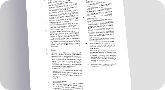 obstacles. In cases of doubt, Customer will decide. 6.3 Upon request, Supplier shall cease to use subcontractors for Customer in connection with FOSS if Customer has 4. Liability and Warranty good cause to doubt the subcontractors’ reliability and 4.1 This document does not establish a responsibility of willingness to cooperate in terms of compliance with Customer's requirements for the use of FOSS. Supplier Supplier for the FOSS and FOSS Derivatives per se, shall bear any costs thereby incurred. save where permitted by the respective FOSS License. Nevertheless, Supplier is obliged to assume liability and provide a warranty for goods or services supplied under 7. General Provisions the terms of the Principal Contract, including those in 7.1 The provisions of the Principal Contract concerning which FOSS or FOSS Derivatives are used. intellectual property rights and rights to use the goods or 4.2 As part of its warranty obligations Supplier shall, services also apply to modified versions of FOSS. without restriction to its duties under clause 3 and save for where this is not permitted under the terms of the If the foregoing clause or any FOSS Licenses give rise respective FOSS License, provide at its own cost to restrictions on the duties of Supplier arising from the maintenance services for the FOSS and FOSS Principal Contract or from this document with respect to Derivatives in accordance with the Principal Contract, in the distribution of unchanged FOSS, such restrictions particular for the rectification of defects. This includes must be expressly agreed in writing in advance and must the obligation to examine the FOSS and FOSS make explicit reference to this document and the Derivatives for potential faults prior to initial use, and Principal Contract. continuously thereafter, and to remedy such faults, in 7.2 Upon request, Supplier shall take all action required to particular if they have security implications. Such be taken by Customer in order to be able to grant rights corrections will be included in the scope of goods or to third parties (such as customers) in accordance with services if Customer grants its consent. the respective FOSS License, in particular making the 4.3 Supplier shall provide integration support for the FOSS source codes publicly available. This also includes the and FOSS Derivatives as requested by Customer and in preparation and publication of documentation, the accordance with the provisions of the Principal Contract, archiving and version management of the individual unless this is not permitted under the terms of the FOSS and FOSS Derivatives, their clear allocation to respective FOSS License. individual goods or services and, if necessary, the 4.4 If Supplier breaches an obligation described herein, it provision and dissemination of the FOSS and FOSS shall indemnify Customer and its affiliated companies Derivatives to third parties in accordance with the and the sales partners, dealers and end customers of respective FOSS Licenses on behalf of Customer. Customer in respect of all claims, losses and costs 7.3 Supplier shall give the required information concerning arising as a result and shall defend the aforementioned the FOSS covered by this document. The nature and parties against third-party claims. Customer may also extent of the information will be agreed with Customer. opt to defend itself. Supplier shall bear the costs of court and out-of-court proceedings including reasonable 7.4 No separate remuneration will be paid for the provision attorney’s fees, even if the defense relates to a merely of Approved FOSS and FOSS Derivatives. The alleged claim. remuneration according to the Principal Contract remains unaffected. 5. Changes 7.5 This document is governed exclusively by the law of the 5.1 Any changes to the FOSS approved by Customer will Federal Republic of Germany, to the exclusion of the require the prior consent of Customer. The procedure for UN Convention on Contracts for the International Sale first use of FOSS will apply accordingly. Supplier shall of Goods (CISG). The courts of Stuttgart have exclusive obtain Customer's approval for changes in good time, jurisdiction for all disputes. This is without prejudice to stating the planned date on which the changes are to be mandatory statutory jurisdictional requirements. No included in the goods or services provided. The arbitration or conciliation agreement has been procedure for changes described in the Principal concluded. Contract will apply in respect of any further implications 7.6 The German version of this document is authoritative. that changes to FOSS may have for the goods or services Translations are provided for convenience only. covered by the Principal Contract. 5.2 Customer may, at its own reasonable discretion and in consideration of Supplier's interests, demand reasonable changes and additions to the use of FOSS at any time until the respective goods or services are delivered or accepted. 6. Duties of Subcontractors 6.1 The use of subcontractors is governed by the provisions of the Principal Contract. The commissioning of subcontractors does not affect Supplier's responsibility to Customer for the provision of the contracted goods or services, in particular with regard to the granting of rights to use the work results. 6.2 Supplier shall select any subcontractors carefully with respect to the requirements set out herein, monitor them and include them in its information and work processes concerning FOSS. This will be demonstrated by suitable documentation, such as excerpts from the corresponding agreements. Customer will be entitled to contact subcontractors directly in order to clarify queries relating to the FOSS used. in such a case Supplier will be informed. Page 2 of 2