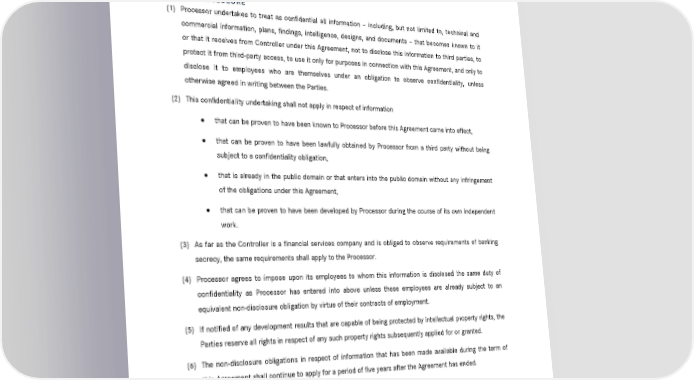Contractual standards for Data Processing on Behalf, last revised December 8, 2014 (5) The group of people (data subjects) affected by the handling of their personal data in the context of this Contract is as follows: (Please describe in concrete terms whose data are affected by the service, e.g. employees of company XY , customer of service A, users of application B, drivers, suppliers, etc. Should this already be described in the Main Agreement, a reference to the Main Agreement may be used: e.g. “The persons concerned by the services are described under section … of the Main Agreement”) 2 NON-DISCLOSURE (1) Processor undertakes to treat as confidential all information – including, but not limited to, technical and commercial information, plans, findings, intelligence, designs, and documents – that becomes known to it or that it receives from Controller under this Agreement, not to disclose this information to third parties, to protect it from third-party access, to use it only for purposes in connection with this Agreement, and only to disclose it to employees who are themselves under an obligation to observe confidentiality, unless otherwise agreed in writing between the Parties. (2) This confidentiality undertaking shall not apply in respect of information • that can be proven to have been known to Processor before this Agreement came into effect, • that can be proven to have been lawfully obtained by Processor from a third party without being subject to a confidentiality obligation, • that is already in the public domain or that enters into the public domain without any infringement of the obligations under this Agreement, • that can be proven to have been developed by Processor during the course of its own independent work. (3) As far as the Controller is a financial services company and is obliged to observe requirements of banking secrecy, the same requirements shall apply to the Processor. (4) Processor agrees to impose upon its employees to whom this information is disclosed the same duty of confidentiality as Processor has entered into above unless these employees are already subject to an equivalent non-disclosure obligation by virtue of their contracts of employment. (5) If notified of any development results that are capable of being protected by intellectual property rights, the Parties reserve all rights in respect of any such property rights subsequently applied for or granted. (6) The non-disclosure obligations in respect of information that has been made available during the term of this Agreement shall continue to apply for a period of five years after the Agreement has ended. 3 DATA PROTECTION (1) Processor collects, processes, and uses personal data on behalf of Controller. Controller is responsible for complying with the provisions of data protection law. (2) Processor shall follow solely the instructions issued by Controller when collecting, processing, and using personal data. Such instructions must be given in writing or by electronic mail. Other than as instructed by Controller, Processor may not use, either for its own purposes or the purposes of third parties, the data to Page 4 of 20