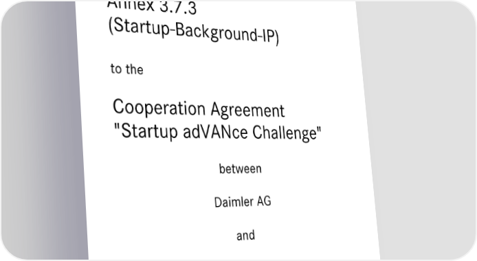 Cooperation Agreement | Startup adVANce Challenge Page 17 Page 191 Startup adVANce | Cooperation Agreement - Annex 3.7.3 Annex 3.7.3 (Startup-Background-IP) to the Cooperation Agreement "Startup adVANce Challenge" between Daimler AG and Startup